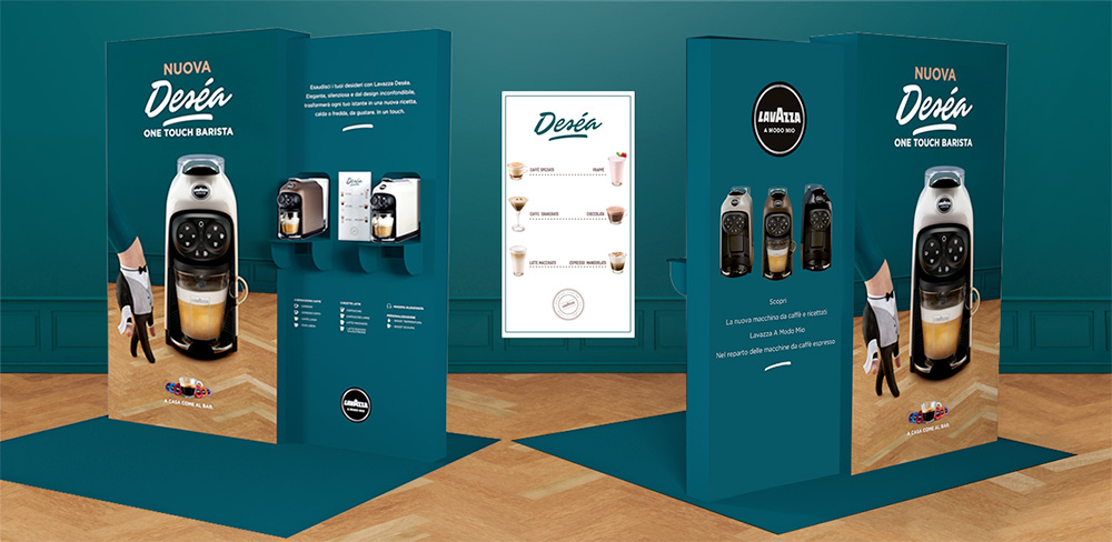 Abbiamo quindi scelto di proporre un progetto che partisse proprio dalle linee e dai colori del prodotto per realizzare una serie di oggetti espositivi coordinati che spiegassero chiaramente le caratteristiche particolari di questa nuova macchina.